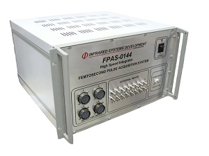 The New Femto-Second Laser Pulse Acquisition System was developed for high speed laser “Pump-Probe” spectroscopy providing 16 to 1024 channel simultaneous sampling from Multi-Element HgCdTe (MCT) Detector Arrays. The FPAS integrates and captures detector signals from short pulse, high-energy laser systems with excellent linearity and a true 16-Bit resolution. The High-speed data acquisition system has been developed by ISDC to provide a complete system for interfacing to an MCT (HgCdTe), or InSb detector array to allow high-speed acquisition from short duration laser pulses. The system includes preamplifier, bias network, and Sample and Hold circuitry for each element in the array, and couples these channels through a high speed multiplexer to an A/D converter. The ADC is then clocked into a FIFO memory to allow synchronous writing and a synchronous reading of the dual port FIFO. This allows the data to be stored in the FIFO by the synchronous acquisition circuitry based on the pulse repetition rate, and the read out is accomplished through a high-speed digital I/O card installed in the host computer. The acquisition starts with the rising edge of the Laser sync pulse, which initiates the delay time. The laser fires very shortly after this rising edge. The MCT signal appears approximately 50-100 ns after the laser fires. The Sample pulse then acquires the preamplifier output signal and Holds until cleared. As soon as the sample interval is completed the first channel is multiplexed to the A/D input, then the A/D conversion is done in 1 usec and clocked into the FIFO memory. When Channel 1 is clocked into memory, Channel 2 is multiplexed to the A/D input and read, then it is clocked into the FIFO. The FIFO empty signal indicates that there is data in the FIFO and the host PC with the digital I/O card monitors this line and begins reading the data from the FIFO as soon as it is available. The entire array is readout and cleared before the next 1Khz rising edge appears to fire the laser again. This process repeats until stopped by the user. The External Inputs can be configured for detectors or a user provided -5 to +5 Volt signal. The signal is sampled and acquired at the same time, using the same integration parameters as the internal detector channels. This allows the user to input analog data from other devices, such as mirror position and also allows for a single element detector to monitor the laser pulse amplitude to correct for variations in the laser energy, which can greatly reduce noise. |